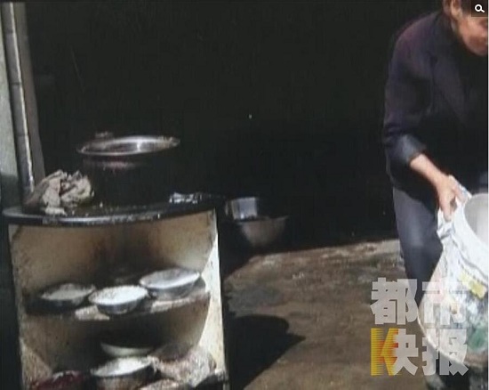炒好的菜直接盛放在地面上,炒菜前用來洗鍋的水,也竟然是刷盆子洗碗用過的刷鍋水。誰能料想到,就是這樣一個黑作坊,每天竟然要給上百人提供中午飯。