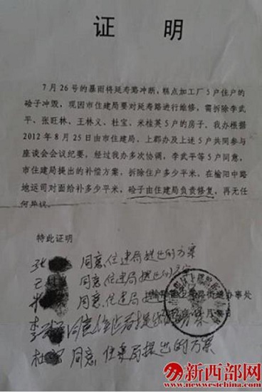 2012年政府承諾給予居民修復鹼子的“證明書”