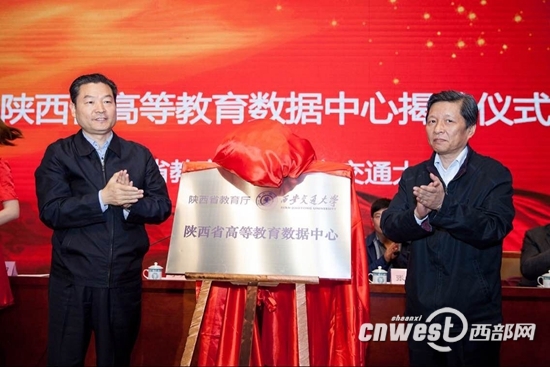 陜西省教育廳廳長李興旺、西安交大校長王樹國為陜西省高等教育數(shù)據(jù)中心揭牌。