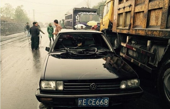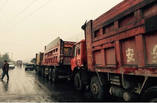 4月18日下午,陜西韓城,多名拉煤司機(jī)被困在韓城市桑樹(shù)坪鎮(zhèn)雷嶺村,當(dāng)?shù)卮迕褡钄r了他們的去路。在雨中,拉煤司機(jī)拉出橫幅并下跪求村民放行。據(jù)了解,當(dāng)?shù)赜幸粋€(gè)礦井,最近一個(gè)公司的車隊(duì)通過(guò)招標(biāo)后和礦井簽訂了協(xié)議,負(fù)責(zé)運(yùn)輸煤礦??墒钱?dāng)?shù)氐拇迕裾J(rèn)為,車隊(duì)較低的價(jià)格影響他們?nèi)サV井拉活兒,所以就讓一些老人和婦女堵著路,不讓車隊(duì)經(jīng)過(guò)拉煤。目前,經(jīng)過(guò)民警做工作,村民已經(jīng)離去,拉煤車輛均已逐一通過(guò)。圖為司機(jī)下跪現(xiàn)場(chǎng)。