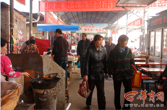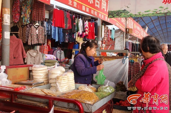 4月14日,渭南市區(qū)一處集貿(mào)市場內(nèi),小吃攤點(diǎn)和服裝攤點(diǎn)混在一起。