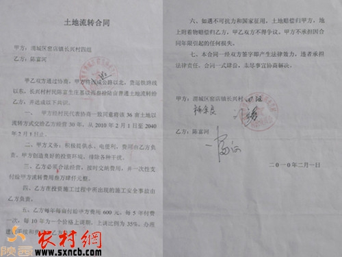 “渭城區(qū)窯店鎮(zhèn)長興四組”(甲方)和“陳富河”(乙方)于2010年2月1日簽訂的“土地流轉(zhuǎn)合同”