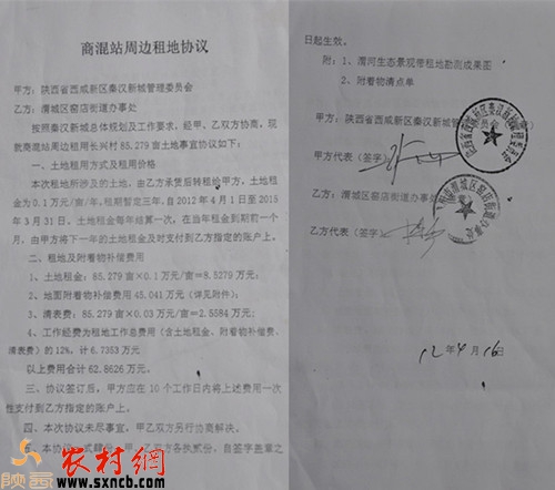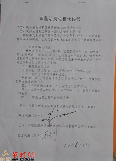 “陜西省西咸新區(qū)秦漢新城管理委員會”(甲方)和“渭城區(qū)窯店街道辦事處”(乙方)于2012年4月16日簽訂的“商混站周邊租地協(xié)議”