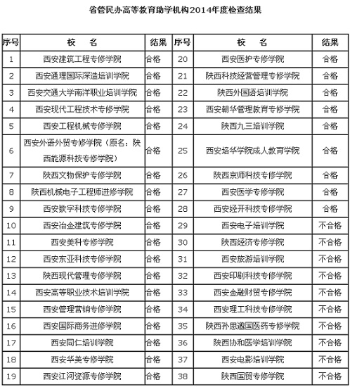 2014年底,陜西省教育廳部署開展了民辦高等教育助學(xué)機構(gòu)(以下簡稱“民教機構(gòu)”)年度檢查工作,以全面掌握年度辦學(xué)情況。省屬38所民教機構(gòu)中,有30所參加了年度檢查,8所未參加年檢。經(jīng)專家組實地檢查和綜合評定,確定年檢合格的28所,不合格10所。