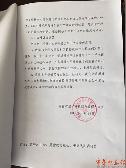 榆林市示范性綜合實(shí)踐基地室內(nèi)綜合實(shí)踐樓工程及監(jiān)理項(xiàng)目招標(biāo)過(guò)程中,招標(biāo)單位榆林育才中學(xué)委托的代理公司榆林市康泰建設(shè)項(xiàng)目代理有限公司與2015年4月1日分別在指定媒體《榆林招標(biāo)采購(gòu)網(wǎng)》和《榆林市人民政府門戶網(wǎng)》發(fā)布了招標(biāo)公告。其中《榆林招標(biāo)采購(gòu)網(wǎng)》發(fā)布的招投標(biāo)報(bào)名時(shí)間是2015年3月31日-4月7日17時(shí),《榆林市人民政府門戶網(wǎng)》發(fā)布的時(shí)間是2015年4月1日至4月8日17時(shí)。經(jīng)過(guò)核對(duì)我辦核發(fā)的紙質(zhì)公告,投標(biāo)報(bào)名時(shí)間是2015年4月1日至4月8日17時(shí)。即《榆林市人民政府門戶網(wǎng)》發(fā)布的公告是準(zhǔn)確無(wú)誤的,經(jīng)查《榆林招標(biāo)采購(gòu)網(wǎng)》發(fā)布的錯(cuò)誤時(shí)間信息,是由于代理公司的疏忽,在給網(wǎng)站上傳的電子信息時(shí)造成的錯(cuò)誤。