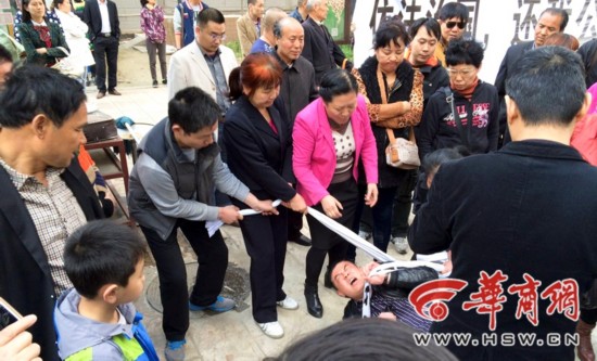 業(yè)主們看到這群人進(jìn)了保安室、監(jiān)控室和老物業(yè)公司,有的還進(jìn)了住宅樓。隨后這群人一邊喊著“找人討債”,一邊找到小區(qū)開(kāi)發(fā)商——陜西銳捷實(shí)業(yè)有限責(zé)任公司一位席姓負(fù)責(zé)人,并拿著白色橫幅把這位五十多歲的男子“五花大綁”,推搡拉倒在地,持續(xù)近一小時(shí)。有小區(qū)業(yè)主說(shuō),這場(chǎng)召集會(huì)和開(kāi)發(fā)商沒(méi)什么關(guān)系,席姓負(fù)責(zé)人是協(xié)調(diào)見(jiàn)面會(huì)的。很快,看不下去的業(yè)主們出手幫忙,這場(chǎng)糾紛成了“討債者”和業(yè)主間的爭(zhēng)端,雙方都有人不同程度受傷,來(lái)人推倒了新物業(yè)辦公室防盜門(mén)。
