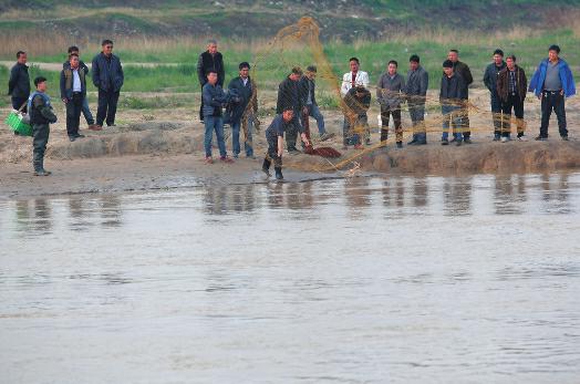 在渭河南邊,一名男子身背一個(gè)小電瓶,手持竹竿,竹竿上有手閘,連著電線,另一頭為鐵絲網(wǎng),鐵絲網(wǎng)伸入水中后,男子捏手閘放電,一陣“滋滋”響聲后,一條2寸長(zhǎng)小魚翻著白肚浮出水面。沿著河邊“電”一圈后,男子收起工具離開。而渭河南邊,幾名男子撒開大網(wǎng),拋向渭河中,過一會(huì)又將網(wǎng)收起,動(dòng)作嫻熟,旁邊有很多市民圍觀。