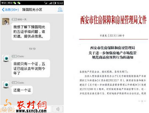 左圖為臻園陽光小區(qū)群里業(yè)主在交流開發(fā)商五證辦理情況,右圖為2014年10月30日,西安市房管局下發(fā)《關(guān)于開展房地產(chǎn)市場秩序?qū)m椪蔚墓妗返氖蟹堪l(fā)(2013)168號文件