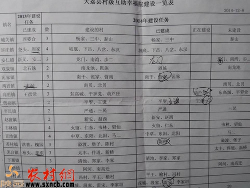 隨后,記者從劉主任那里索要了一份《大荔縣村級互助幸福院建設(shè)一覽表》,落款日期為2014年12月8日。