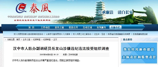 漢中市人防辦副調(diào)研員岳友山涉嫌嚴(yán)重違紀(jì)違法,目前正接受組織調(diào)查。(漢中市紀(jì)委)