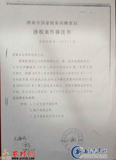 據(jù)群眾反映,渭南市臨渭區(qū)國稅局轄區(qū)內另一企業(yè)秦達商貿有限公司也存在虛開增值稅發(fā)票情況。臨渭區(qū)國稅局王某局長表示,經查這一情況也屬實。目前,該案件已移交至渭南市公安局經偵大隊。
