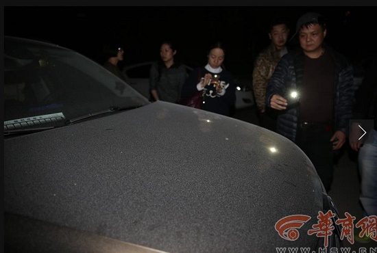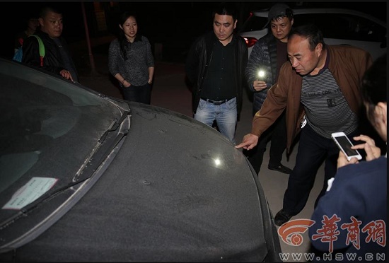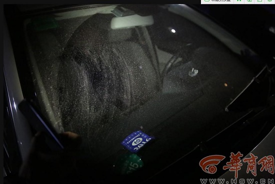 3月29日晚10時(shí)許,在豐禾路蔚藍(lán)花城小區(qū),和曹女士有同樣遭遇的十多名業(yè)主,還在商量著車(chē)的事。曹女士說(shuō),小區(qū)沒(méi)有地下車(chē)位,所有業(yè)主的車(chē)都在路面上停,3月28日晚,她將車(chē)停在25號(hào)樓附近的路面上。第二天是周日,她出門(mén)時(shí)發(fā)現(xiàn)前擋風(fēng)玻璃上有一層灰,用玻璃水刷了半天還是臟,把車(chē)開(kāi)出去洗了可還是一點(diǎn)用都沒(méi)有。車(chē)身滿是灰白色的點(diǎn),玻璃上更是,怎么都洗不掉。