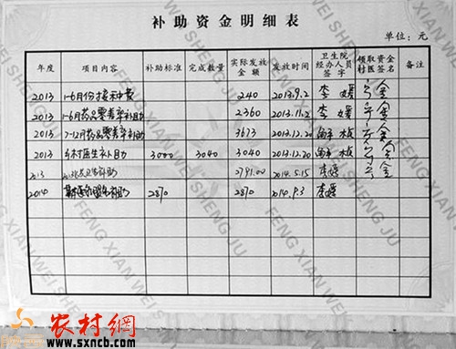 隨后記者在該縣平木鎮(zhèn)、坪坎鎮(zhèn)、黃牛鋪鎮(zhèn)、留鳳關(guān)鎮(zhèn)等了解到的情況和上面鎮(zhèn)村發(fā)放補助資金比例基本一致,宣傳牌也攤派收費還有村醫(yī)反映,去年衛(wèi)生局給每個村級衛(wèi)室制作了一個疾病防治小知識宣傳牌,市場制作費也就是700多元。后來鎮(zhèn)衛(wèi)生院發(fā)放公衛(wèi)資金,讓村醫(yī)簽字然后直接從公衛(wèi)補助資金里扣了2815元,該村醫(yī)指著明細(xì)表一欄說,就是從這一欄里的基本醫(yī)療服務(wù)補助2870元中扣除的,也沒開發(fā)票。