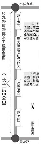 經(jīng)九路道路排水工程南起南二環(huán)南邊的青龍路,北至鳳城九路,全長(zhǎng)11.95公里,設(shè)計(jì)寬度30—50米。