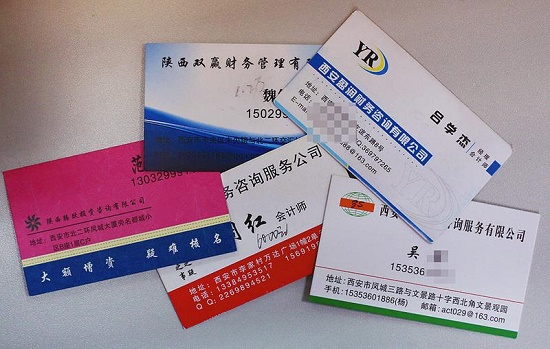 隨后,她叫來(lái)不遠(yuǎn)處的一位留著寸頭,上身著灰色休閑服,下身穿牛仔褲,手拿水杯的男子,男子也笑呵呵地走了過(guò)來(lái)。女子將情況向他“匯報(bào)”后,他同樣操著南方口音,問(wèn)了記者幾個(gè)問(wèn)題,諸如“營(yíng)業(yè)執(zhí)照辦了沒(méi)有?辦公地址在哪兒?有沒(méi)有停車(chē)場(chǎng)地?”等等,顯得十分專(zhuān)業(yè)。記者表示都有,男子思考后表示得12000元。不過(guò)他并沒(méi)有把話說(shuō)死,記者問(wèn)他能否便宜時(shí),他表示:“等你確定要辦的時(shí)候,咱再商量,到時(shí)候打電話?!彪S后,遞給記者一張名片,上面寫(xiě)著“陜西雙贏財(cái)務(wù)管理有限公司魏經(jīng)理、辦公電話及地址?!?