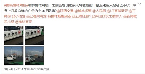 據(jù)新浪微博爆料:榆林博林駕校,之前還培訓(xùn)殘疾人駕駛技能,最近殘疾人報(bào)名也不收,車身上打著這樣的廣告的字樣還配嗎?