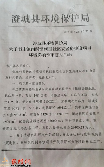 澄環(huán)函(2013)27號《澄城縣環(huán)境保護局關于韋莊鎮(zhèn)南酥酪新型社區(qū)安置房建設項目環(huán)境影響預審意見的函》