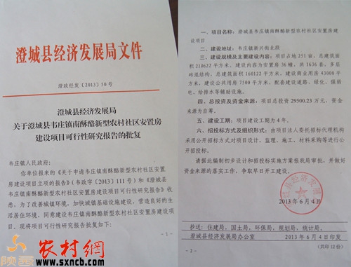 隨后楊副鎮(zhèn)長向記者出示了和售樓部接待中心相吻合的三份相關文件原件暨澄政土函(2013)45號《澄城縣國土資源局關于韋莊鎮(zhèn)南酥酪新型農村社區(qū)安置房建設項目用地預審的意見》、澄環(huán)函(2013)27號《澄城縣環(huán)境保護局關于韋莊鎮(zhèn)南酥酪新型社區(qū)安置房建設項目環(huán)境影響預審意見的函》和澄政經發(fā)(2013)50號《澄城縣經濟發(fā)展局關于韋莊鎮(zhèn)南酥酪新型農村社區(qū)安置房建設項目可行性研究報告的批復》,又有一份澄政規(guī)函(2013)3號《澄城縣城鄉(xiāng)規(guī)劃管理局關于韋莊鎮(zhèn)南酥酪新型農村社區(qū)安置房建設選址意見的函》。