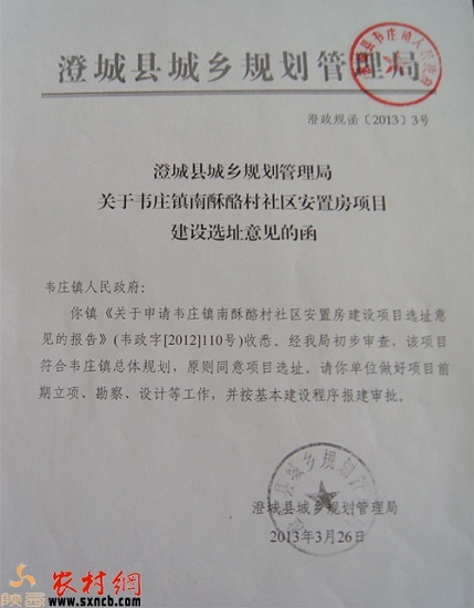 澄政規(guī)函(2013)3號《澄城縣城鄉(xiāng)規(guī)劃管理局關于韋莊鎮(zhèn)南酥酪新型農村社區(qū)安置房建設選址意見的函》