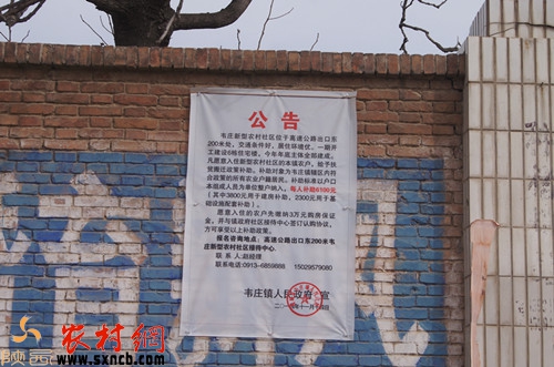 當記者問道在“五證”不全時能否進行銷售時,楊副鎮(zhèn)長接著說目前只是收取1萬元的預付金,現(xiàn)在銷售也不怎么好,目前最多銷售了10來套房,政府不管銷售。房地產老板最近開年還沒來,前幾天還打電話聯(lián)系,讓其抓緊時間辦理相關手續(xù)。記者接著又問,群眾在新型農村社區(qū)購房有什么優(yōu)惠政策?楊副鎮(zhèn)長說沒什么優(yōu)惠,優(yōu)惠只是地產開發(fā)商的優(yōu)惠政策,這些房屬性為商品房。記者便問道:那村上張貼的《公告》又作何解釋?楊副鎮(zhèn)長回答說這是開發(fā)商為了更好的銷售,以政府名義發(fā)出的公告。隨后便取出公告向記者展示,《公告》顯示,凡愿意入住新型農村社區(qū)的本鎮(zhèn)農戶,給與扶貧搬遷補助。補助對象為韋莊鎮(zhèn)轄區(qū)內符合政策的所有農業(yè)戶籍居民。補助標準以戶口本組成為單位整戶納入,每人補助6100元,(其中3800原用于建房補助,2300元用于基礎設施配套補助)。愿意入住的農戶先交納3萬元購房保證金,并與鎮(zhèn)政府社區(qū)接待中心簽訂認購協(xié)議,方可享受以上政策。當記者問道每人補助6100元是怎么回事?有無政策依據?楊副鎮(zhèn)長回答說這是給所在村村民的補償優(yōu)惠,是通過縣上扶貧辦協(xié)調的。