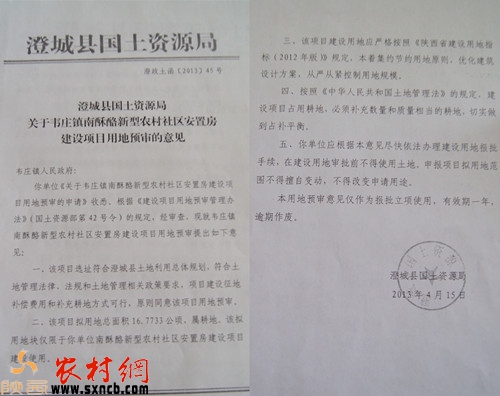 澄政土函(2013)45號《澄城縣國土資源局關于韋莊鎮(zhèn)南酥酪新型農村社區(qū)安置房建設項目用地預審的意見》
