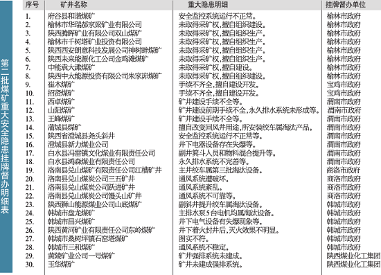 昨日,記者從各省安監(jiān)局獲悉,省安委會辦公室對第二批煤礦重大安全隱患掛牌督辦的名單進(jìn)行公布,涉及到榆林、寶雞、渭南、商洛市、韓城市等地。