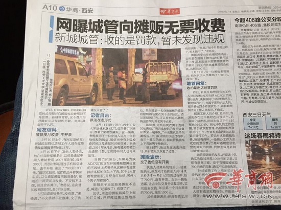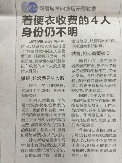3月10日,有網(wǎng)友在華商論壇爆料:新城區(qū)紅華巷的攤販,每月要給城管繳納700到1000元的費(fèi)用,作為占道擺攤的代價(jià)。3月18日《華商報(bào)》報(bào)道,有兩個(gè)攤販坦言,分別被收取700元和1000元的現(xiàn)金。對此,新城區(qū)城管執(zhí)法局紀(jì)委介入調(diào)查,并于18日晚,對5家攤販進(jìn)行詢問,目前正在形成核查結(jié)果,并隨即公布。