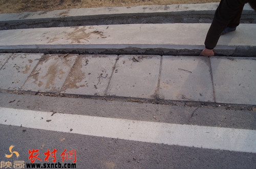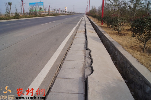 3月13日,記者驅(qū)車來到大荔來到所反映的路段西四環(huán)高鐵路段,剛?cè)氪罄蟪俏?,就能看見寬敞的路面中間豎立著一塊石碑“中國棗鄉(xiāng)”四個(gè)大字,道路兩旁樹木路燈淋漓,顯得格外寬敞,便沿著此路一路前行,在據(jù)南黃村南不遠(yuǎn)處,就看到路面崎嶇不平,多處裂縫,排水渠也顯得搖搖欲墜,行人車輛也是繞道而行。