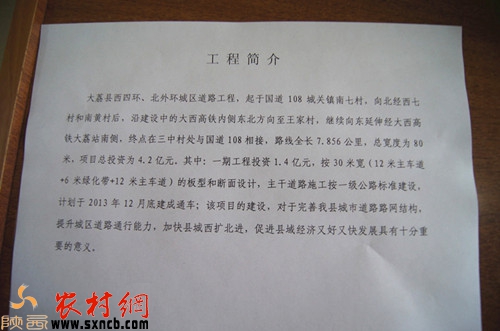 記者隨后在大荔官方網(wǎng)站獲悉,此路段為國道108大荔城區(qū)段一級(jí)公路改建工程,起點(diǎn)位于大荔縣城關(guān)鎮(zhèn)南七村,向北沿縣城規(guī)劃的西四環(huán)布線,經(jīng)西七村、南黃村后,沿大西高鐵內(nèi)側(cè)(東南側(cè))折向東北方向后,再沿縣城規(guī)劃的北外環(huán)布線,經(jīng)大西高鐵大荔站南側(cè)和三中村,終點(diǎn)與現(xiàn)國道108相接,全長8公里,按寬30米的一級(jí)公路標(biāo)準(zhǔn)進(jìn)行建設(shè),其斷面設(shè)計(jì)為12米+6米+12米。項(xiàng)目總投資約1.4億元。該項(xiàng)目是交通運(yùn)輸部確定的國道108渭南至大荔漢村一線公路改建示范的一部分,采用BT方式(即“建設(shè)--移交”)招商引資進(jìn)行建設(shè)。經(jīng)過公開競招,2012年6月1日大荔縣政府已與渭南華通路橋工程有限責(zé)任公司達(dá)成一致正式簽約。