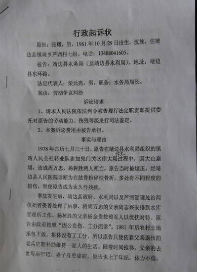 一九八一年后農(nóng)村土地承包下放,工分制廢止,張耀一家就沒(méi)有生活來(lái)源,導(dǎo)致兩個(gè)孩子輟學(xué),妻子又患癌癥,當(dāng)時(shí)其只能依靠父親張永智復(fù)原軍人補(bǔ)助金維持一家人的生活,不料父親去逝后就停止了供養(yǎng),當(dāng)事人已進(jìn)入生活的絕路,只好從鎮(zhèn)、縣、市政府、縣級(jí)水利局等多個(gè)單位上訪,最終靖邊縣殘聯(lián)于2005年4月16日給申請(qǐng)人頒發(fā)了肢體三級(jí)殘疾證,至今未享受過(guò)一分錢(qián)的待遇。2009年5月5日靖邊縣水利局向靖邊縣勞動(dòng)保障局出函證明張耀致殘不能正常處理。無(wú)奈之下,當(dāng)事人又反映到榆林市人民政府信訪局,2009年9月18日榆林市政府信訪聯(lián)席會(huì)議批復(fù)靖邊縣政府查處,至今數(shù)載輪回,依然石沉大海。2012年12月26日張耀繼續(xù)申請(qǐng)工傷認(rèn)定,靖邊縣水務(wù)局在申請(qǐng)書(shū)和申請(qǐng)表上簽字蓋章,認(rèn)可工傷事實(shí),但拒絕出據(jù)受權(quán)委托書(shū),使工傷認(rèn)定不能進(jìn)入程序。2014年1月20日申請(qǐng)人再次向靖邊縣水務(wù)局申請(qǐng)工傷認(rèn)定及勞動(dòng)能力鑒定。靖邊縣水務(wù)局于2014年2月24日在“榆林市勞動(dòng)能力鑒定審批表”上簽字蓋章,并稱張耀受傷是個(gè)人行為,不予出據(jù)相關(guān)受權(quán)委托書(shū)。2014年4月30日申請(qǐng)人專題申請(qǐng)靖邊縣水務(wù)局委托工傷認(rèn)定和傷殘等級(jí)鑒定,靖邊縣水務(wù)局在申請(qǐng)書(shū)上簽字蓋章,仍然不能出據(jù)規(guī)范性委托文書(shū),其理由是:“事實(shí)經(jīng)過(guò)是真的,靖邊縣水務(wù)局能證明,但是他們委托了就要賠錢(qián),到時(shí)候會(huì)有很多麻煩,所以只能給張耀蓋章,不能出委托書(shū)”。在這種走投無(wú)路的情況下,申請(qǐng)人也多次向中央駐陜巡視組反映了情況后靖邊縣信訪局向其口頭答復(fù)“你的傷殘是真的,水利局為了同情受害者多年來(lái)的傷痛,所以在其的申請(qǐng)書(shū)上蓋了公章,他們只能口頭答復(fù)”。經(jīng)當(dāng)事人再三請(qǐng)求,靖邊縣靖信復(fù)字(2014)9號(hào)文件于2014年10月21日答復(fù)意見(jiàn)書(shū)出臺(tái)。
