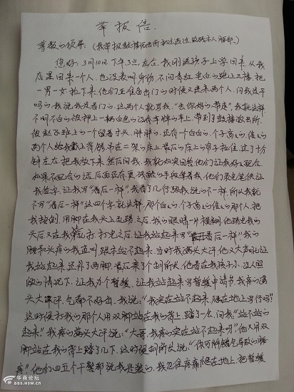 您好;3月10日下午3點(diǎn)左右,我剛送孩子上學(xué)回來,從我店里回來一個人,也沒表明身份,不問青紅皂白的跑上三樓,把一男一女拉下來。他們正準(zhǔn)備出門的時候又進(jìn)了兩個人,問我是干嘛的。我說我是看門的,這兩個人就罵我:“去你媽的帶走。”我就這樣不明不白的被押上了一輛白的的沒有車牌的車上。被帶到了鼓樓派出所。被趙飛班上一個留著寸頭,胖胖的,還有一個白白的,個子高高的的兩個人給我戴上了手銬(背銬),吊在了二架的床上。最后把窗子上的簾子拉住。過了十分鐘左右,把我放下來。然后問我,我就如實回答,他們讓我好好配合。如果不配合的話,后面還有更殘酷的手段等著我。他們錄完筆供證,讓我寫“看后一樣”我看了幾行字跟我說的不一樣,所以我就不寫“看后一樣”四個字。就這樣,那個白白的,個子高高的,俊俊的那個人,把我按倒,用腳在我頭上亂踢。之后,我的眼睛一片模糊,他踢完我的頭后,又在我身上亂打。打完之后。又讓我站起來寫“看后一樣”。我的腰和頭疼的我直叫。根本站不起來。當(dāng)時我滿頭大汗,他又大聲吼著。讓我站起來還補(bǔ)了兩腳。最后來了個胡所長。他看在我孩子小,又沒人照顧的情況下,讓我辦個暫緩,讓我站起來寫暫緩申請書。我疼得滿頭大汗,氣都不好出。我說“我實在站不起來,趴在地上寫行嗎?”這時候打我的那個人用雙腳站在我的背上,踏了一會兒,問我“站不站的起來。”我疼得滿頭大汗說:“大哥,我疼得實在站不起來呀?!彼钟秒p腳站在我的背上踏了幾下。這時候胡所長說;“你可能錯氣導(dǎo)致的腰疼。”他們四五個干警都說我是裝的。我忍住疼痛趴在地上,把暫緩申請書寫下。然后打我的那個人說:“只要老子在這所里一天,你就別準(zhǔn)備好開你那招待所,老子下班都要去你那里查你,老子等機(jī)會一定要刑事你。”也許他們看我實在站不起來,然后把我從里面的地板上拖到外面的車上。送到榆林附屬醫(yī)院,做完檢查之后,把我拉回到鼓樓派出所。他們說:“附屬醫(yī)院的大夫說你的身體檢查一切正常。”然后又把我抬到你輛黑車上,司機(jī)不敢拉。最后又把我抬回派出所。因為我疼痛難忍,大喊大叫,干警們無奈之下?lián)芡?20,把我拉到榆林北方醫(yī)院。直到3月12號。我痛的飯吃不上,水喝不上。民警們對我不聞不問。(舉報:鼓樓派出所執(zhí)法時嚴(yán)刑逼供,拳打腳踢,逼供未成,看到我已經(jīng)站不起來了,派出所抬我到醫(yī)院檢查又拉回所里。不久,派出所看到打的我已經(jīng)違法出事了。隨后撥打120把我送到北方醫(yī)院。經(jīng)醫(yī)院檢查致殘本人腰部。鼓樓派出所執(zhí)法違法。)