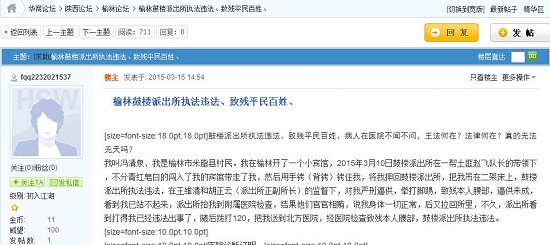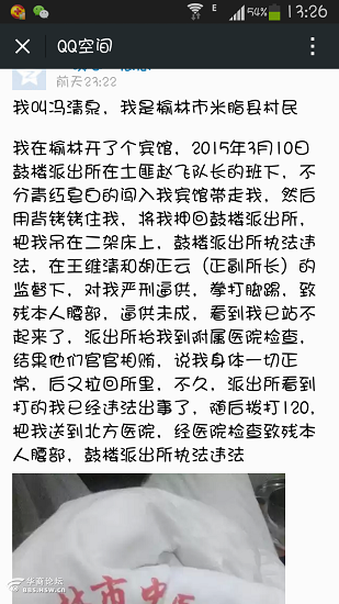 我叫馮清泉、我是榆林市米脂縣村民。我在榆林開了一個小賓館,2015年3月10日鼓樓派出所在一幫土匪趙飛隊長的帶領(lǐng)下,不分青紅皂白的闖入了我的賓館帶走了我,然后用手銬(背銬)銬住我,將我押回鼓樓派出所,把我吊在二架床上,鼓樓派出所執(zhí)法違法,在王維清和胡正云(派出所正副所長)的監(jiān)督下,對我嚴(yán)刑逼供,拳打腳踢,致殘本人腰部,逼供未成,看到我已站不起來,派出所抬我到附屬醫(yī)院檢查,結(jié)果他們官官相賄,說我身體一切正常,后又拉回所里,不久,派出所看到打得我已經(jīng)違法出事了,隨后撥打120,把我送到北方醫(yī)院,經(jīng)醫(yī)院檢查致殘本人腰部,鼓樓派出所執(zhí)法違法。