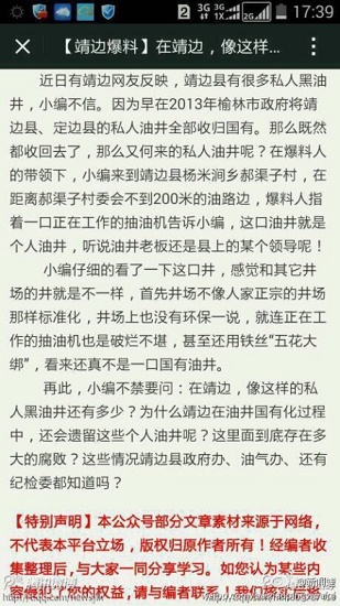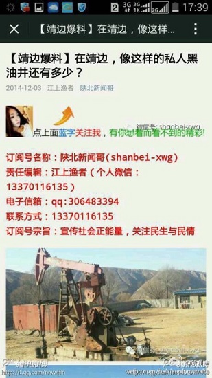 據(jù)微信爆料:近日有靖邊網(wǎng)友反映,靖邊縣有很多私人黑油井,小編不信。因為早在2013年榆林市政府將靖邊縣、定邊縣的私人油井全部收歸國有。那么既然都收回去了,那么又何來的私人油井呢?筆者于2015年3月10日,一行人在靖邊縣張山村采風時,看見一個沒有#號的井場,現(xiàn)場柴油機一直在旋轉(zhuǎn)工作,污染場面一塌糊涂。在2015年稱史上最牛的環(huán)保法,違法人公開挑戰(zhàn)新環(huán)保法嗎?