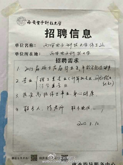 3月10日,有網(wǎng)友在微博上貼出一張西安電子科技大學(xué)保衛(wèi)處的招聘海報(bào),并吐槽,“在大西安@西安電子科技大學(xué)當(dāng)個(gè)保安,都要碩士學(xué)歷,你不努力行嗎?”