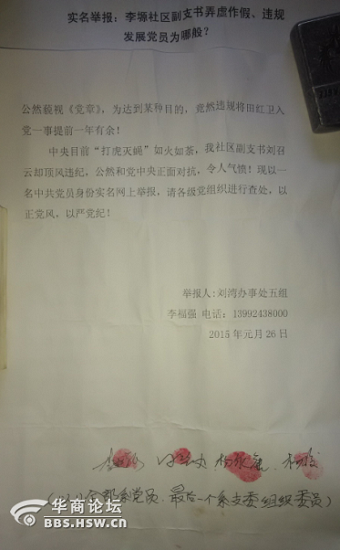 我叫李福強(qiáng),家住劉灣辦事處李塬社區(qū)五組,中共黨員,現(xiàn)實(shí)名舉報我社區(qū)副支部書記劉召云(原主持工作)弄虛作假、違規(guī)發(fā)展黨員一事,請各級黨組織及新聞媒體和廣大群眾對此做出處理及評議!