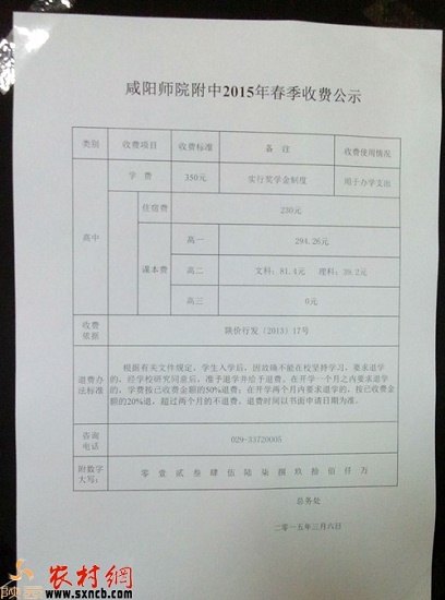 近日,陜西農(nóng)村網(wǎng)接到咸陽(yáng)師范學(xué)院附屬中學(xué)(以下簡(jiǎn)稱咸陽(yáng)師范附中)學(xué)生家長(zhǎng)反映:“在今年春季開學(xué)報(bào)名時(shí),學(xué)校張貼的收費(fèi)標(biāo)準(zhǔn)根本就不執(zhí)行,只是擺設(shè)應(yīng)付檢查,每個(gè)學(xué)生又多收取1300多元費(fèi)用,不知道收取的是什么費(fèi)?而且也沒(méi)開任何票據(jù),希望媒體能前來(lái)采訪了解!”