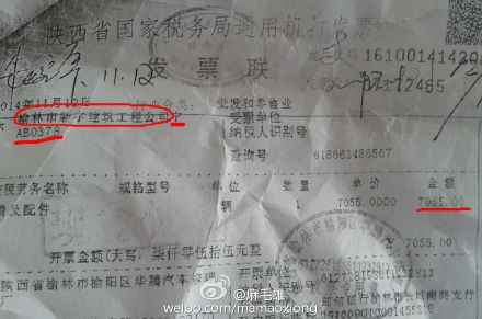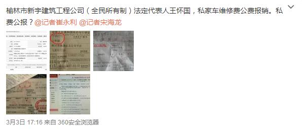 據(jù)新浪微博爆料:榆林市新宇建筑工程公司(全民所有制)法定代表人王懷國,私家車維修費公費報銷。私費公報?