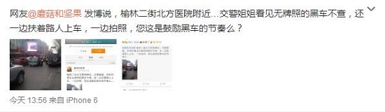 據(jù)新浪微博爆料:榆林二街北方醫(yī)院附近…交警姐姐,你說你看見無(wú)牌照的黑車不查,還一邊扶著路人上車,一邊拍照,您這是鼓勵(lì)黑車的節(jié)奏么…
