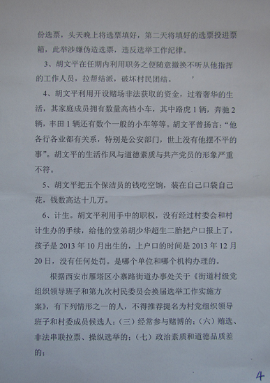 2、選舉村代表時,小寨街道辦事處將票樣交給胡文平的哥哥胡文華(村隊長),胡文華安排人員弄虛作假,印制兩份選票,頭天晚上將選票填好,第二天將填好的選票投進票箱,此舉涉嫌偽造選票,違反選舉工作紀律。