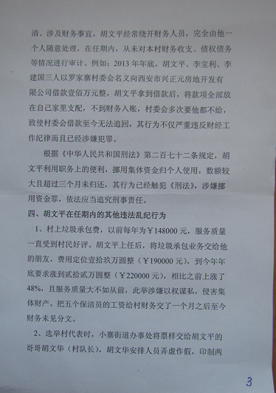 3、胡文平在任期內利用職務之便隨意撤換不聽從他指揮的工作人員,拉幫結派,破壞村民團結。