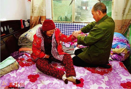 姚富國(guó)為母親穿衣。