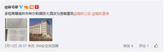 據(jù)新浪微博爆料:佳縣劉漢寬實(shí)名舉報(bào)榆陽區(qū)法院副院長(zhǎng)王文平等多名榆林官員股東,將未經(jīng)驗(yàn)收合格的希爾斯國(guó)際大酒店違章建筑出租給經(jīng)營(yíng)商,騙取200多萬承包費(fèi)及1800多萬裝修費(fèi),導(dǎo)致經(jīng)營(yíng)商損失高達(dá)3000多萬。