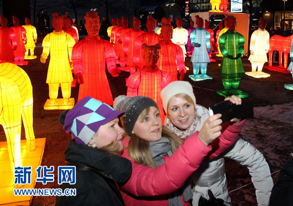 2月18日,在芬蘭首都赫爾辛基,游人在兵馬俑造型彩燈前拍照留念。由北京市朝陽區(qū)文化館帶來的創(chuàng)意“兵馬俑彩燈展”在春節(jié)前夕亮相赫爾辛基水晶宮廣場。 新華社記者李驥志攝