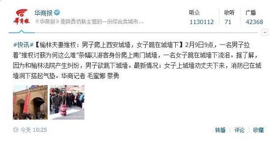 2月9日9點,一名男子拉著“維權(quán)討薪為何這么難”條幅以游客身份爬上南門城墻,一名女子跪在城墻下流淚。據(jù)了解,因為和榆林法院產(chǎn)生糾紛,男子欲跳下城墻。最新情況:女子上城墻勸丈夫下來,消防已在城墻洞下搭起氣墊。(記者 毛蜜娜 蔡勇)