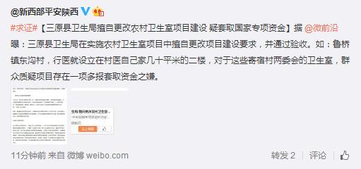 據(jù)新浪微博爆料:2011年,中央劃撥專項資金針對農(nóng)村衛(wèi)生基礎(chǔ)設(shè)施實施了衛(wèi)生室建設(shè)項目,要求嚴格按照項目規(guī)劃和標準進行建設(shè),必須做到專款專用、不得套取、挪用、也不得購買已建成的房屋,更不得用于償還以往債務(wù)。