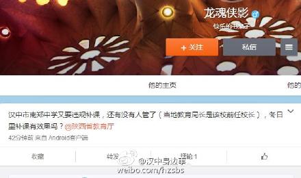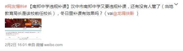 據(jù)新浪微博爆料:漢中市南鄭中學(xué)又要違規(guī)補(bǔ)課,還有沒(méi)有人管了(當(dāng)?shù)亟逃珠L(zhǎng)是該校前任校長(zhǎng)),冬日里補(bǔ)課有效果嗎?