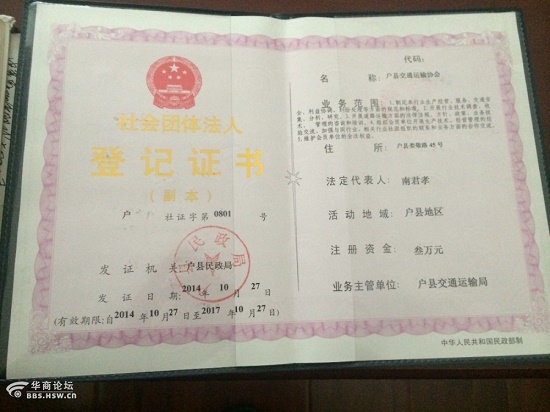 戶(hù)縣民政局民政科的薛姓工作人員則告訴記者,他們按照工作制度工作,戶(hù)縣交通運(yùn)輸協(xié)會(huì)備案資料齊全。同時(shí)為記者出示了相關(guān)資料,資料顯示,戶(hù)縣交通運(yùn)輸協(xié)會(huì)業(yè)務(wù)主管單位為戶(hù)縣交通運(yùn)輸局,由陜西省戶(hù)縣運(yùn)輸公司和西安戶(hù)縣通源運(yùn)輸有限公司于2008年4月15日向戶(hù)縣交通運(yùn)輸局發(fā)起“關(guān)于籌備戶(hù)縣道路運(yùn)輸協(xié)會(huì)的申請(qǐng)”,并于當(dāng)日批復(fù)申請(qǐng);2014年10月27日社會(huì)團(tuán)體法人登記證書(shū)上的法定代表人為南孝君;在編號(hào)為1203的社會(huì)團(tuán)體法人登記表上記者看到經(jīng)費(fèi)來(lái)源一項(xiàng)寫(xiě)著“會(huì)費(fèi)”兩個(gè)字。當(dāng)記者提到關(guān)于戶(hù)縣交通運(yùn)輸協(xié)會(huì)亂收取會(huì)費(fèi)這個(gè)問(wèn)題時(shí),薛姓工作人員僅表示他們目前已經(jīng)按照國(guó)家規(guī)定對(duì)社會(huì)團(tuán)體進(jìn)行了整改。