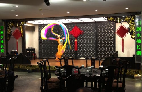 昨天中午12時(shí)30分,記者再次來到成都映象川菜館二樓大廳,已經(jīng)有十幾桌客人正在吃飯。一名服務(wù)員忙上前招呼說,緊挨舞臺(tái)第一排餐桌看得最清楚的屬于甲座,中間的屬于乙座,最后面的屬于丙座。隨著戲曲鼓點(diǎn)響起,第一個(gè)表演的是水袖長舞,演員長長的水袖上下翻滾舞動(dòng)。一位正在吃飯的男士稱,他來附近辦事請三個(gè)朋友吃飯,剛坐下才知道吃飯要買戲票,因?yàn)槭钦埧陀植缓靡馑甲撸缓糜仓^皮坐下,“如果我們四個(gè)最低消費(fèi)超過了504元(一個(gè)人平均消費(fèi)168元)聽說不用花錢買戲票。”