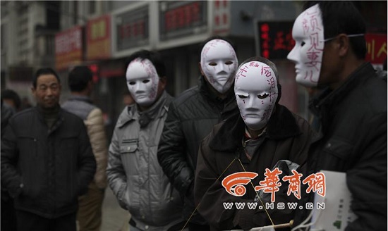 戴著面具的農(nóng)民工站在尚德路上討薪