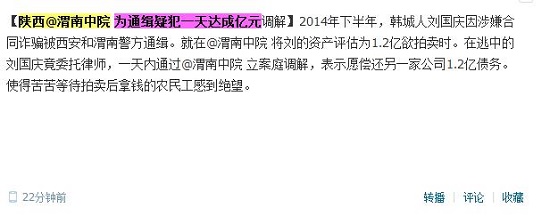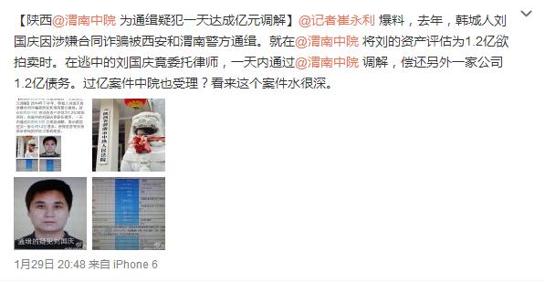 據(jù)新浪微博爆料:去年,韓城人劉國(guó)慶因涉嫌合同詐騙被西安和渭南警方通緝。就在@渭南中院將劉的資產(chǎn)評(píng)估為1.2億欲拍賣(mài)時(shí)。在逃中的劉國(guó)慶竟委托律師,一天內(nèi)通過(guò)@渭南中院調(diào)解,償還另外一家公司1.2億債務(wù)。過(guò)億案件中院也受理?看來(lái)這個(gè)案件水很深。